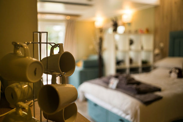 Our contemporary lodge with a little more space & fully featured cooking facilities, situated at the edge of our small wood with a large deck to sit out on. Inside there is a spacious lounge with TV, dining table & chairs and separate bedroom area with a full size double bed. There is a fully featured kitchen with oven, dual rings, microwave, fridge, kettle & toaster. There is also a bathroom with shower, sink & loo.